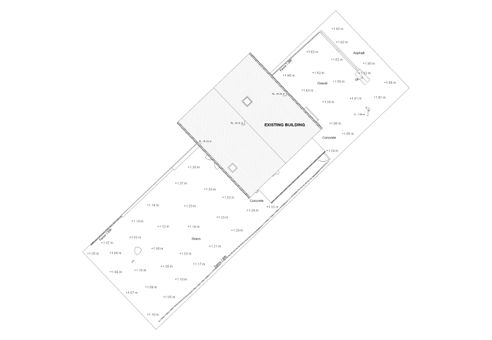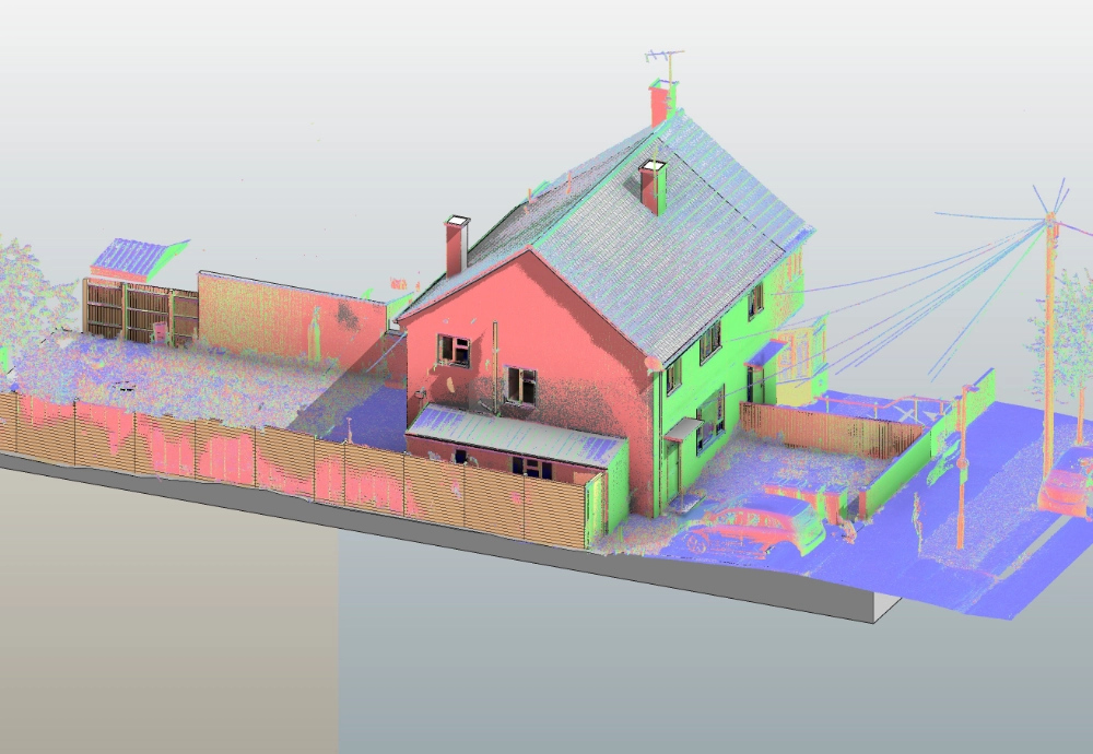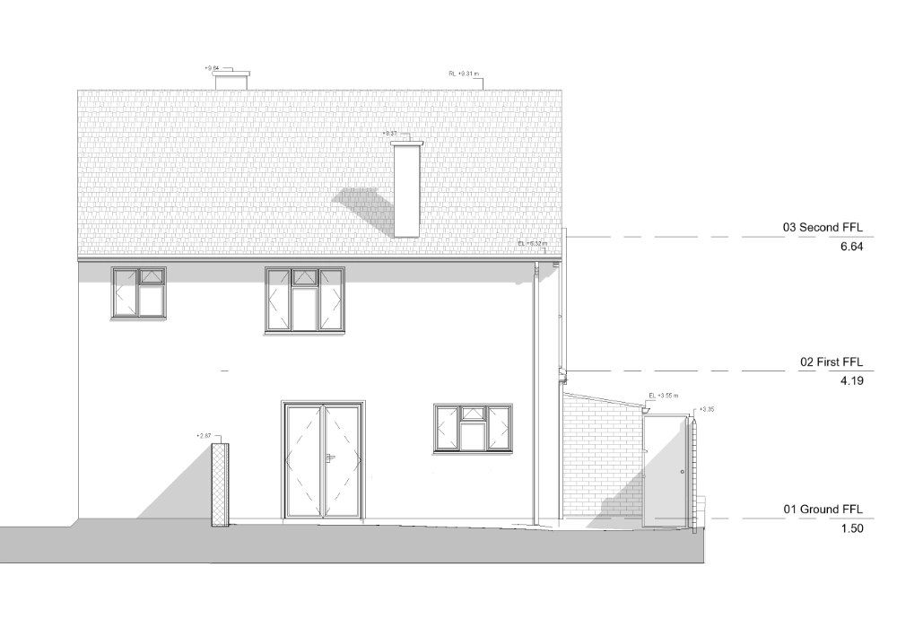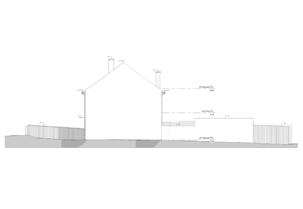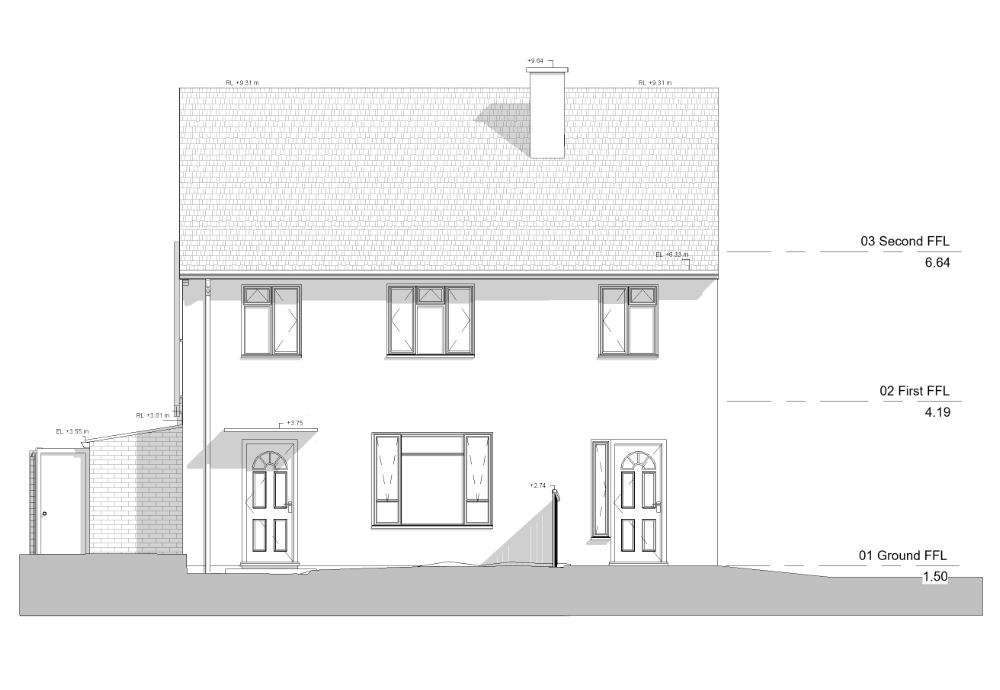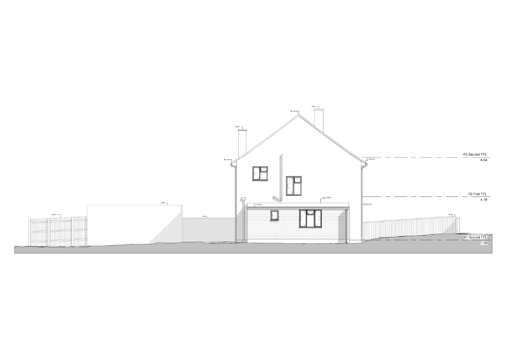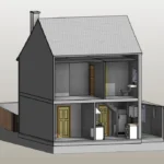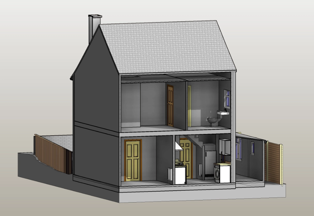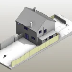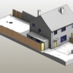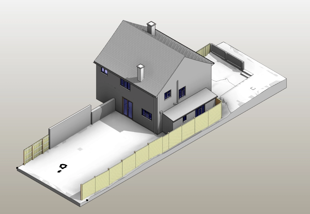 The external context was modelled to include garden levels extending 3 meters around the property, along with boundary elements such as garden fencing. Rainwater pipes and downpipes were incorporated to reflect external drainage arrangements. Vegetation was excluded from the scope, as it was not required for design coordination.
