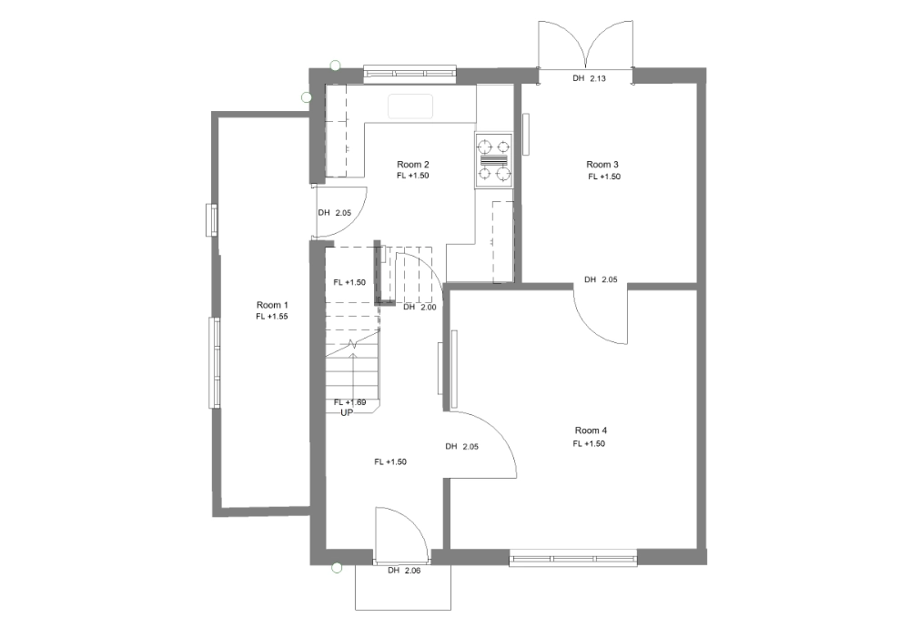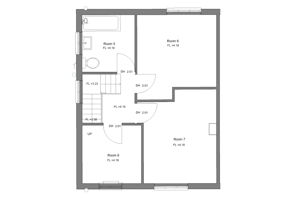 The scope focused exclusively on architectural elements, with no structural or detailed internal MEP modelling required. The existing building was modelled as “existing” condition, with no demolition phase represented. No work in the loft was required and no joists or beams included.